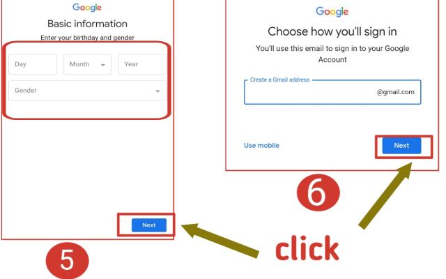 5. step 5 मैं आपको अपनी जन्म तारीख enter करनी है. आपकी जो birth date हैं उसे सिलेक्ट करना है और अपना gender सिलेक्ट करना है (male or female). और आपको next के बटन को प्रेस करना next