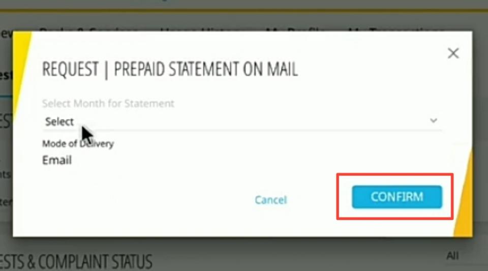 9. जैसे ही आप request के icon पर क्लिक करेंगे उसके बाद आपको थोड़ा सा scroll down करना है, और नीचे आपको complaints के ऑप्शन में से prepaid statement on mail को select करना है. और उसके बाद Go button पर क्लिक करें.