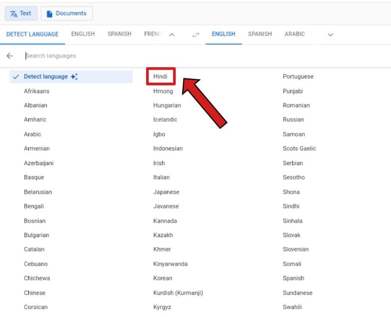 Hindi to English translator tool - फिर आपको detect language वाले option पर click करके हिंदी भाषा को select करना है. और इसके बाजू वाले box में आपको English भाषा को select करें.